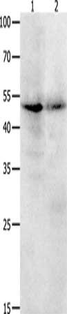 • Gel: 10+12+15%SDS-PAGE, Lysate: 40 μg, Lane 1-2: Jurkat cells, human ovarian cancer tissue, Primary antibody: CSB-PA234904(KLF5 Antibody) at dilution 1/1700, Secondary antibody: Goat anti rabbit IgG at 1/8000 dilution, Exposure time: 20 seconds