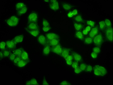 Immunofluorescence staining of Hela cells with CSB-PA22879A0Rb at 1:100, counter-stained with DAPI. The cells were fixed in 4% formaldehyde, permeabilized using 0.2% Triton X-100 and blocked in 10% normal Goat Serum. The cells were then incubated with the antibody overnight at 4°C. The secondary antibody was Alexa Fluor 488-congugated AffiniPure Goat Anti-Rabbit IgG(H+L).