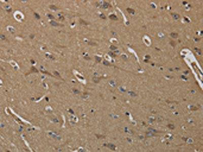 The image on the left is immunohistochemistry of paraffin-embedded Human brain tissue using CSB-PA979606(KLK6 Antibody) at dilution 1/60, on the right is treated with fusion protein. (Original magnification: ×200)