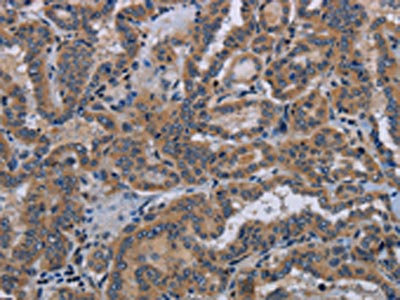 The image on the left is immunohistochemistry of paraffin-embedded Human thyroid cancer tissue using CSB-PA648146(KLK8 Antibody) at dilution 1/30, on the right is treated with fusion protein. (Original magnification: ×200)