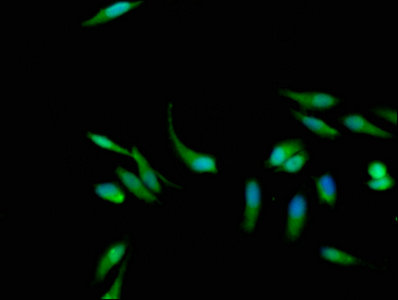 Immunofluorescence staining of Hela cells with CSB-PA13969A0Rb at 1:133, counter-stained with DAPI. The cells were fixed in 4% formaldehyde, permeabilized using 0.2% Triton X-100 and blocked in 10% normal Goat Serum. The cells were then incubated with the antibody overnight at 4°C. The secondary antibody was Alexa Fluor 488-congugated AffiniPure Goat Anti-Rabbit IgG(H+L).
