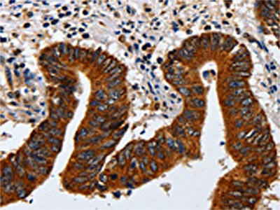 • The image on the left is immunohistochemistry of paraffin-embedded Human colon cancer tissue using CSB-PA041845(KRT23 Antibody) at dilution 1/20, on the right is treated with fusion protein. (Original magnification: ×200)