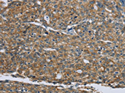 The image on the left is immunohistochemistry of paraffin-embedded Human ovarian cancer tissue using CSB-PA002912(KRT5 Antibody) at dilution 1/30, on the right is treated with fusion protein. (Original magnification: ×200)