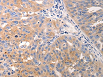 The image on the left is immunohistochemistry of paraffin-embedded Human ovarian cancer tissue using CSB-PA937892(KRT6A/KRT6B/KRT6C Antibody) at dilution 1/50, on the right is treated with synthetic peptide. (Original magnification: ×200)