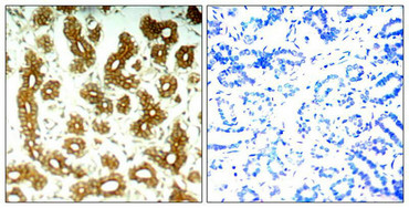 Immunohistochemical analysis of paraffin-embedded human breast carcinoma tissue using Keratin 8(Ab-74) Antibody(left) or the same antibody preincubated with blocking peptide(right).