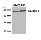 Western blot analysis of extracts from HUVEC and 293 cells using Keratin 8(Ab-74) Antibody.