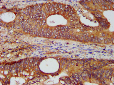 IHC image of CSB-PA773030LA01HU diluted at 1:400 and staining in paraffin-embedded human colon cancer performed on a Leica BondTM system. After dewaxing and hydration, antigen retrieval was mediated by high pressure in a citrate buffer (pH 6.0). Section was blocked with 10% normal goat serum 30min at RT. Then primary antibody (1% BSA) was incubated at 4°C overnight. The primary is detected by a biotinylated secondary antibody and visualized using an HRP conjugated SP system.