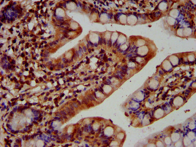 IHC image of CSB-PA773030LA01HU diluted at 1:400 and staining in paraffin-embedded human small intestine tissue performed on a Leica BondTM system. After dewaxing and hydration, antigen retrieval was mediated by high pressure in a citrate buffer (pH 6.0). Section was blocked with 10% normal goat serum 30min at RT. Then primary antibody (1% BSA) was incubated at 4°C overnight. The primary is detected by a biotinylated secondary antibody and visualized using an HRP conjugated SP system.