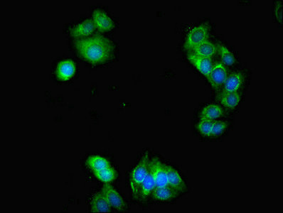 Immunofluorescent analysis of HepG2 cells using CSB-PA706635LA01HU at dilution of 1:100 and Alexa Fluor 488-congugated AffiniPure Goat Anti-Rabbit IgG(H+L)