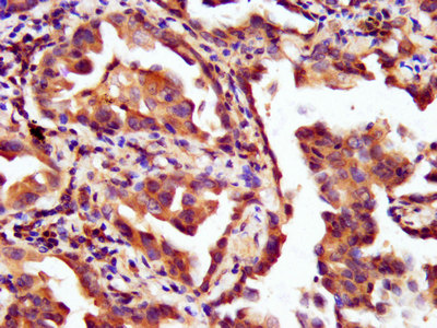 IHC image of CSB-PA618803LA01HU diluted at 1:200 and staining in paraffin-embedded human lung cancer performed on a Leica BondTM system. After dewaxing and hydration, antigen retrieval was mediated by high pressure in a citrate buffer (pH 6.0). Section was blocked with 10% normal goat serum 30min at RT. Then primary antibody (1% BSA) was incubated at 4°C overnight. The primary is detected by a biotinylated secondary antibody and visualized using an HRP conjugated SP system.