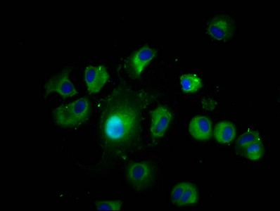 Immunofluorescence staining of MCF-7 cells with CSB-PA757083LA01HU at 1:200, counter-stained with DAPI. The cells were fixed in 4% formaldehyde, permeabilized using 0.2% Triton X-100 and blocked in 10% normal Goat Serum. The cells were then incubated with the antibody overnight at 4°C. The secondary antibody was Alexa Fluor 488-congugated AffiniPure Goat Anti-Rabbit IgG(H+L).