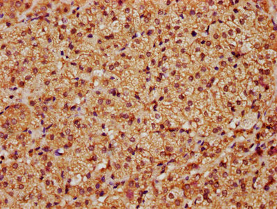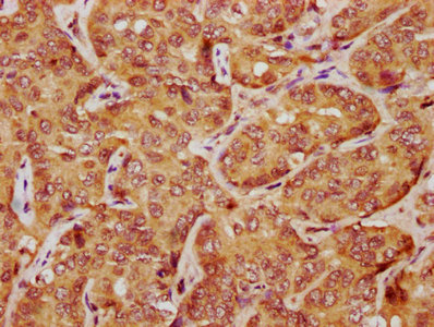 • IHC image of CSB-PA012769LA01HU diluted at 1:1200 and staining in paraffin-embedded human liver cancer performed on a Leica BondTM system. After dewaxing and hydration, antigen retrieval was mediated by high pressure in a citrate buffer (pH 6.0). Section was blocked with 10% normal goat serum 30min at RT. Then primary antibody (1% BSA) was incubated at 4°C overnight. The primary is detected by a biotinylated secondary antibody and visualized using an HRP conjugated SP system.