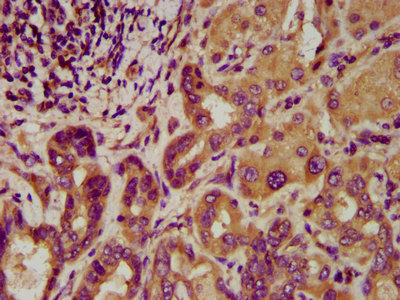 IHC image of CSB-PA818678LA01HU diluted at 1:200 and staining in paraffin-embedded human liver cancer performed on a Leica BondTM system. After dewaxing and hydration, antigen retrieval was mediated by high pressure in a citrate buffer (pH 6.0). Section was blocked with 10% normal goat serum 30min at RT. Then primary antibody (1% BSA) was incubated at 4°C overnight. The primary is detected by a biotinylated secondary antibody and visualized using an HRP conjugated SP system.