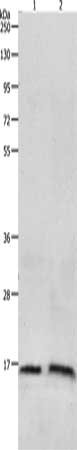 • Gel: 10+12%SDS-PAGE, Lysate: 40 μg, Lane 1-2: 293T cells, Human fetal brain tissue, Primary antibody: CSB-PA031640(LHB Antibody) at dilution 1/250, Secondary antibody: Goat anti rabbit IgG at 1/8000 dilution, Exposure time: 5 minutes
