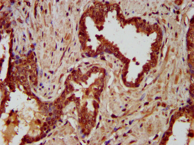 IHC image of CSB-PA848833LA01HU diluted at 1:200 and staining in paraffin-embedded human prostate cancer performed on a Leica BondTM system. After dewaxing and hydration, antigen retrieval was mediated by high pressure in a citrate buffer (pH 6.0). Section was blocked with 10% normal goat serum 30min at RT. Then primary antibody (1% BSA) was incubated at 4°C overnight. The primary is detected by a biotinylated secondary antibody and visualized using an HRP conjugated SP system.