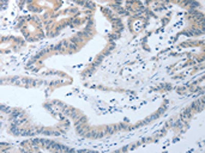 • The image on the left is immunohistochemistry of paraffin-embedded Human colon cancer tissue using CSB-PA808676(LOX Antibody) at dilution 1/25, on the right is treated with synthetic peptide. (Original magnification: ×200)