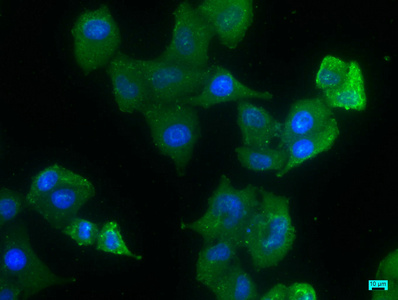 Immunofluorescence staining of Hela cells with CSB-PA013091NA01HU at 1:133, counter-stained with DAPI. The cells were fixed in 4% formaldehyde, permeabilized using 0.2% Triton X-100 and blocked in 10% normal Goat Serum. The cells were then incubated with the antibody overnight at 4°C. The secondary antibody was Alexa Fluor 488-congugated AffiniPure Goat Anti-Rabbit IgG(H+L).