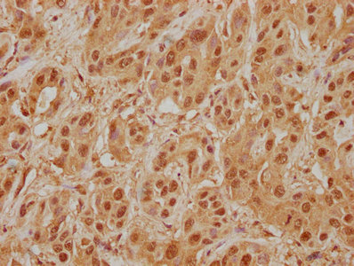 IHC image of CSB-PA013091NA01HU diluted at 1:400 and staining in paraffin-embedded human liver cancer performed on a Leica BondTM system. After dewaxing and hydration, antigen retrieval was mediated by high pressure in a citrate buffer (pH 6.0). Section was blocked with 10% normal goat serum 30min at RT. Then primary antibody (1% BSA) was incubated at 4°C overnight. The primary is detected by a biotinylated secondary antibody and visualized using an HRP conjugated SP system.