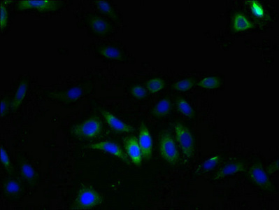 Immunofluorescent analysis of HepG2 cells using CSB-PA743982LA01HU at dilution of 1:100 and Alexa Fluor 488-congugated AffiniPure Goat Anti-Rabbit IgG(H+L)