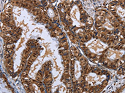 The image on the left is immunohistochemistry of paraffin-embedded Human esophagus cancer tissue using CSB-PA918865(LTA4H Antibody) at dilution 1/30, on the right is treated with fusion protein. (Original magnification: ×200)