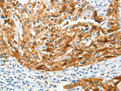 The image on the left is immunohistochemistry of paraffin-embedded Human esophagus cancer tissue using CSB-PA903964(MAF Antibody) at dilution 1/50, on the right is treated with synthetic peptide. (Original magnification: ×200)