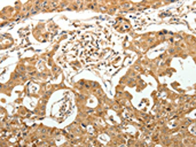 The image on the left is immunohistochemistry of paraffin-embedded Human ovarian cancer tissue using CSB-PA218026(MAP1B Antibody) at dilution 1/40, on the right is treated with synthetic peptide. (Original magnification: ×200)