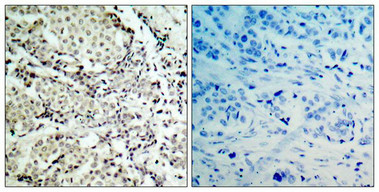 Immunohistochemical analysis of paraffin-embedded human breast carcinoma tissue using MKK3(Ab-189) Antibody(left) or the same antibody preincubated with blocking peptide(right).