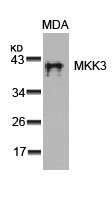 Western blot analysis of extracts from MDA cells using MKK3(Ab-189) Antibody.
