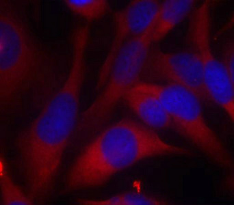 Immunofluorescence staining of methanol-fixed Hela cells using MKK6(Ab-207) Antibody.