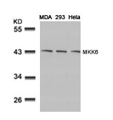 Western blot analysis of extracts from MDA, 293 and Hela cells using MKK6(Ab-207) Antibody.