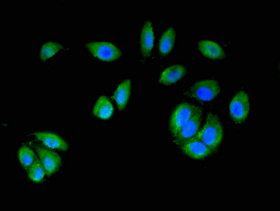 • Immunofluorescence staining of A549 cells with CSB-PA013415LA01HU at 1:200, counter-stained with DAPI. The cells were fixed in 4% formaldehyde, permeabilized using 0.2% Triton X-100 and blocked in 10% normal Goat Serum. The cells were then incubated with the antibody overnight at 4°C. The secondary antibody was Alexa Fluor 488-congugated AffiniPure Goat Anti-Rabbit IgG(H+L).