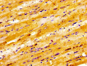 • IHC image of CSB-PA013426LA01HU diluted at 1:100 and staining in paraffin-embedded human heart tissue performed on a Leica BondTM system. After dewaxing and hydration, antigen retrieval was mediated by high pressure in a citrate buffer (pH 6.0). Section was blocked with 10% normal goat serum 30min at RT. Then primary antibody (1% BSA) was incubated at 4°C overnight. The primary is detected by a biotinylated secondary antibody and visualized using an HRP conjugated ABC system.