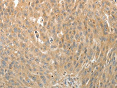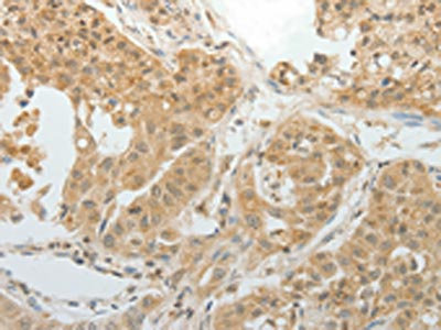 The image on the left is immunohistochemistry of paraffin-embedded Human ovarian cancer tissue using CSB-PA256025(MAP4 Antibody) at dilution 1/10, on the right is treated with fusion protein. (Original magnification: ×200)