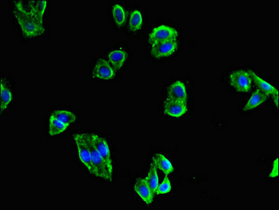 • Immunofluorescent analysis of HepG2 cells using CSB-PA013449LA01HU at dilution of 1:100 and Alexa Fluor 488-congugated AffiniPure Goat Anti-Rabbit IgG(H+L)