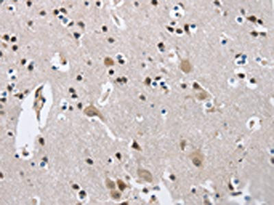 The image on the left is immunohistochemistry of paraffin-embedded Human brain tissue using CSB-PA029620(MAPT Antibody) at dilution 1/40, on the right is treated with synthetic peptide. (Original magnification: ×200)