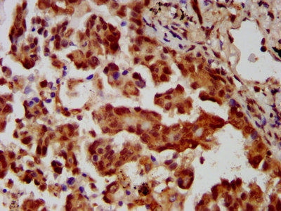 • IHC image of CSB-PA889101LA01HU diluted at 1:400 and staining in paraffin-embedded human lung cancer performed on a Leica BondTM system. After dewaxing and hydration, antigen retrieval was mediated by high pressure in a citrate buffer (pH 6.0). Section was blocked with 10% normal goat serum 30min at RT. Then primary antibody (1% BSA) was incubated at 4°C overnight. The primary is detected by a biotinylated secondary antibody and visualized using an HRP conjugated SP system.