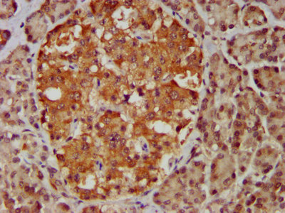 • IHC image of CSB-PA889101LA01HU diluted at 1:400 and staining in paraffin-embedded human pancreatic tissue performed on a Leica BondTM system. After dewaxing and hydration, antigen retrieval was mediated by high pressure in a citrate buffer (pH 6.0). Section was blocked with 10% normal goat serum 30min at RT. Then primary antibody (1% BSA) was incubated at 4°C overnight. The primary is detected by a biotinylated secondary antibody and visualized using an HRP conjugated SP system.