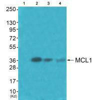 • Western blot analysis of extracts from HuvEc cells (Lane 2), JK cells (Lane 3) and cos-7 cells (Lane 4), using MCL1 antiobdy. The lane on the left is treated with synthesized peptide.