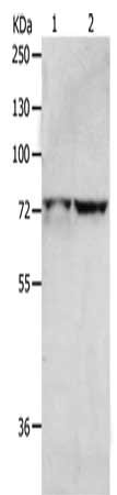 Gel: 8%SDS-PAGE, Lysate: 40 μg, Lane 1-2: Hela cells, 293T cells, Primary antibody: CSB-PA966451(MCMBP Antibody) at dilution 1/1300, Secondary antibody: Goat anti rabbit IgG at 1/8000 dilution, Exposure time: 2 minutes
