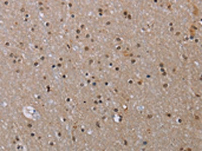 • The image on the left is immunohistochemistry of paraffin-embedded Human brain tissue using CSB-PA936493(MED12 Antibody) at dilution 1/40, on the right is treated with synthetic peptide. (Original magnification: ×200)