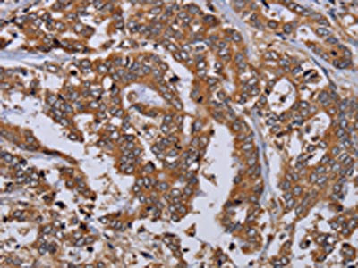 The image on the left is immunohistochemistry of paraffin-embedded Human colon cancer tissue using CSB-PA447621(MFAP3L Antibody) at dilution 1/50, on the right is treated with fusion protein. (Original magnification: ×200)