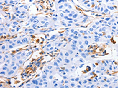 • The image on the left is immunohistochemistry of paraffin-embedded Human lung cancer tissue using CSB-PA929799(MFN1 Antibody) at dilution 1/60, on the right is treated with fusion protein. (Original magnification: ×200)