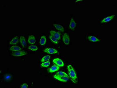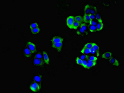 Immunofluorescent analysis of PC-3 cells using CSB-PA713104LA01HU at dilution of 1:100 and Alexa Fluor 488-congugated AffiniPure Goat Anti-Rabbit IgG(H+L)