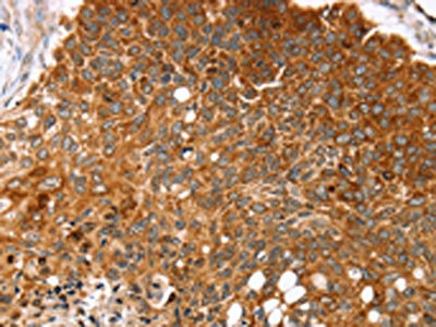 The image on the left is immunohistochemistry of paraffin-embedded Human esophagus cancer tissue using CSB-PA218758(MGST1 Antibody) at dilution 1/35, on the right is treated with synthetic peptide. (Original magnification: ×200)