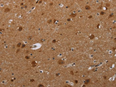 • The image on the left is immunohistochemistry of paraffin-embedded Human brain tissue using CSB-PA597310(MIG7 Antibody) at dilution 1/20, on the right is treated with synthetic peptide. (Original magnification: ×200)