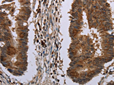 • The image on the left is immunohistochemistry of paraffin-embedded Human colon cancer tissue using CSB-PA597310(MIG7 Antibody) at dilution 1/20, on the right is treated with synthetic peptide. (Original magnification: ×200)