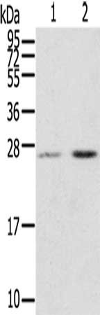 • Gel: 12%SDS-PAGE, Lysate: 40 μg, Lane 1-2: Human placenta tissue, Human breast infiltrative duct tissue, Primary antibody: CSB-PA597310(MIG7 Antibody) at dilution 1/200, Secondary antibody: Goat anti rabbit IgG at 1/8000 dilution, Exposure time: 15 seconds