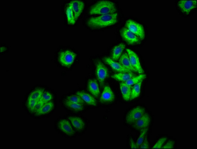 Immunofluorescence staining of HepG2 cells with CSB-PA013834LA01HU at 1:66, counter-stained with DAPI. The cells were fixed in 4% formaldehyde, permeabilized using 0.2% Triton X-100 and blocked in 10% normal Goat Serum. The cells were then incubated with the antibody overnight at 4°C. The secondary antibody was Alexa Fluor 488-congugated AffiniPure Goat Anti-Rabbit IgG(H+L).