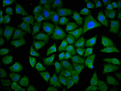 Immunofluorescence staining of Hela cells with CSB-PA853375LA01HU at 1:133, counter-stained with DAPI. The cells were fixed in 4% formaldehyde, permeabilized using 0.2% Triton X-100 and blocked in 10% normal Goat Serum. The cells were then incubated with the antibody overnight at 4°C. The secondary antibody was Alexa Fluor 488-congugated AffiniPure Goat Anti-Rabbit IgG(H+L).