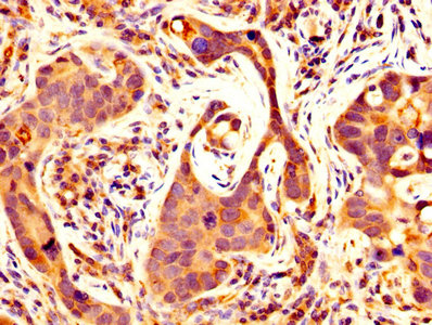 IHC image of CSB-PA12389A0Rb diluted at 1:500 and staining in paraffin-embedded human pancreatic cancer performed on a Leica BondTM system. After dewaxing and hydration, antigen retrieval was mediated by high pressure in a citrate buffer (pH 6.0). Section was blocked with 10% normal goat serum 30min at RT. Then primary antibody (1% BSA) was incubated at 4°C overnight. The primary is detected by a biotinylated secondary antibody and visualized using an HRP conjugated SP system.